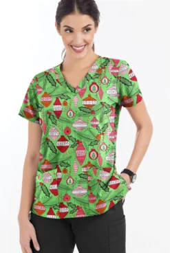 Butter-Soft Christmas Baubles Grass Green Women’s 4-Pocket Rounded V-Neck Print Scrub Top