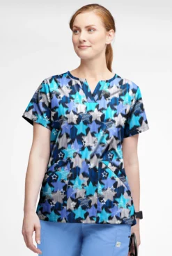 Butter-Soft Shining Stars Womenâs 4-Pocket V Notch-Neck Printed Scrub Top
