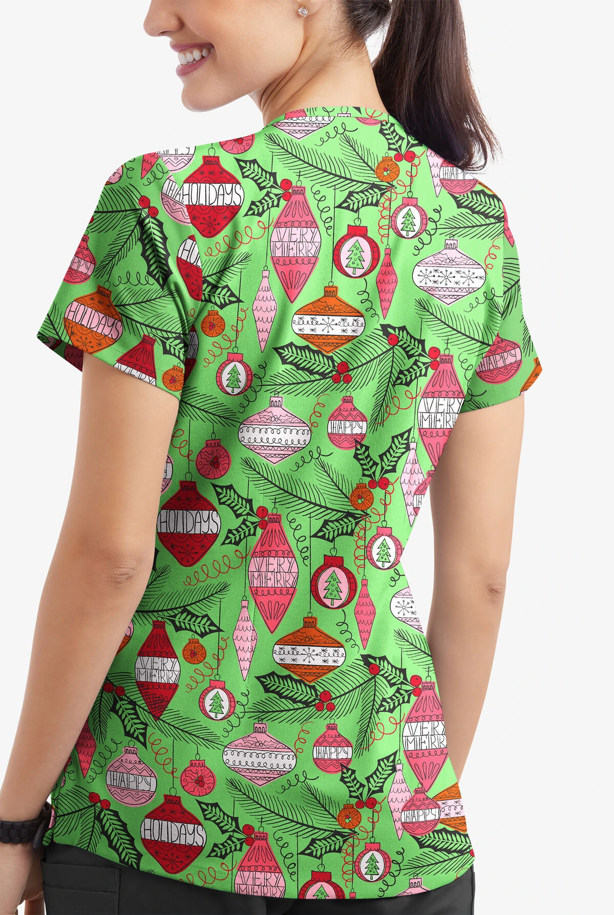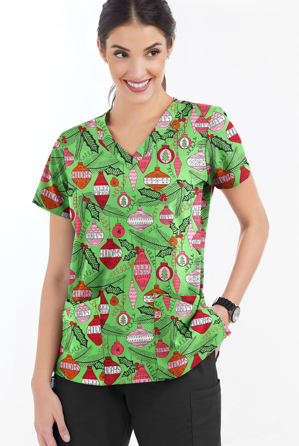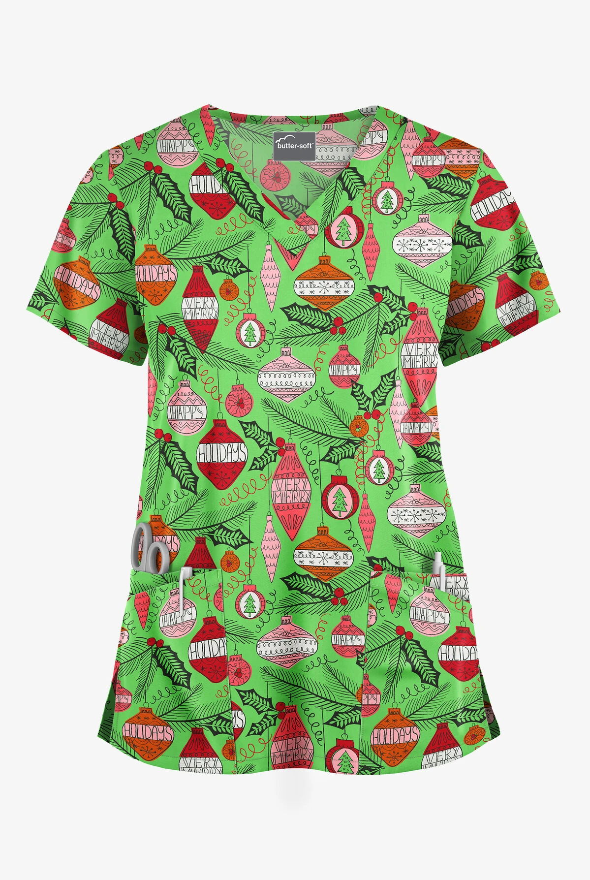 Our rounded V-neck is both flattering and functional. The Butter-Soft Original scrub collection delivers you the durability you demand and the comfort you deserve in our signature lightly brushed easy-care fabric. Bauble. What a fun word to say. And Christmas baubles on a green background are fun to look at.