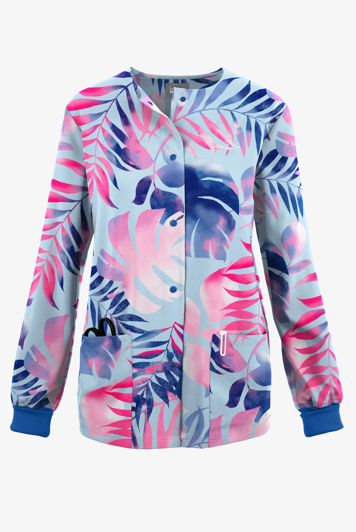 Consider this your go-to warm-up scrub jacket. Simple, clean design is universally flattering and has just enough storage with its two oversized patch pockets and third smaller pocket, ideal for phones, in wearers right side pocket.