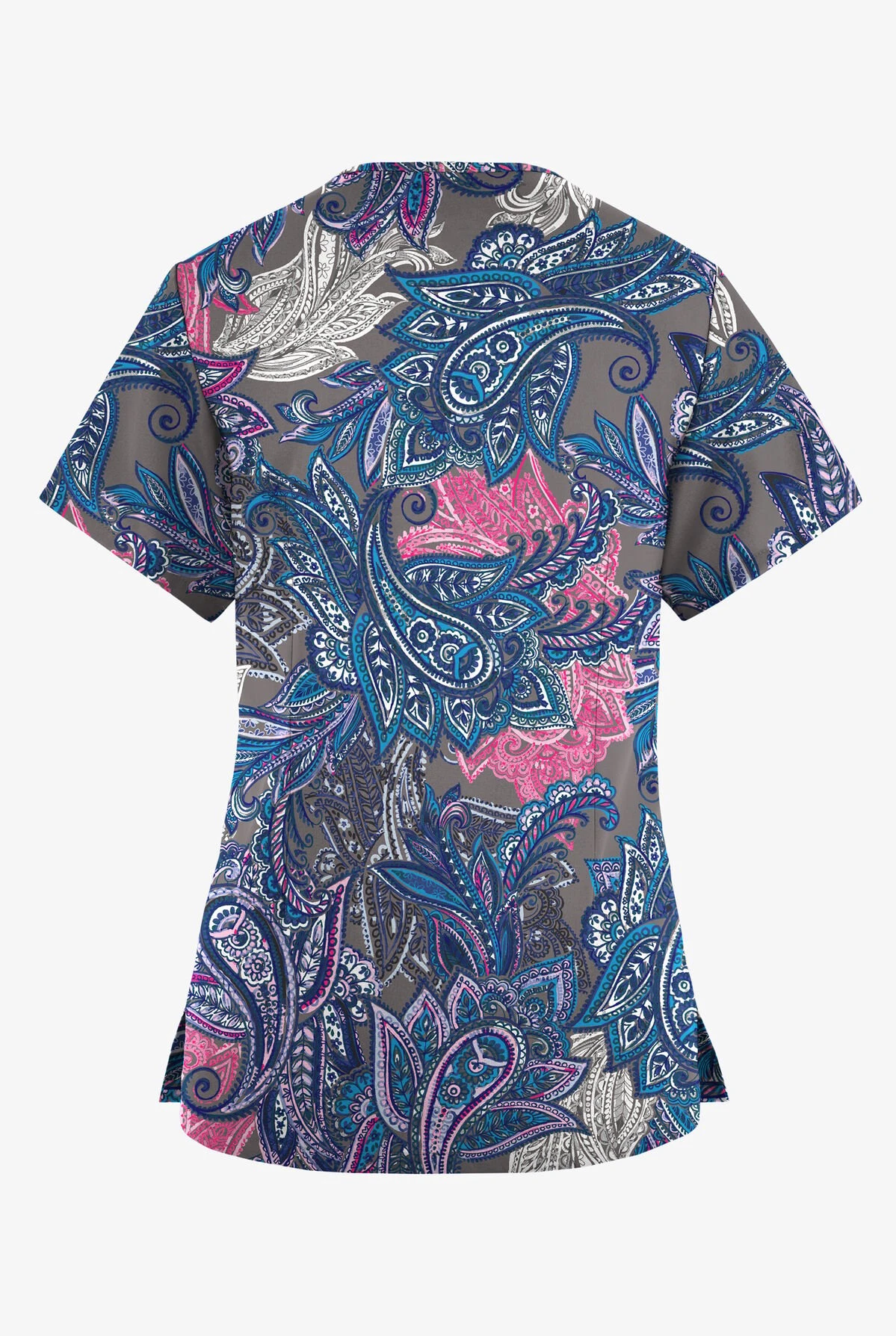 - Features a multilayer pink-and-blue paisley on grey