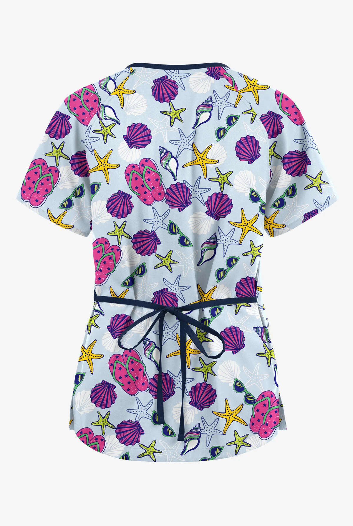- Features flip-flop sandals, starfish and shells