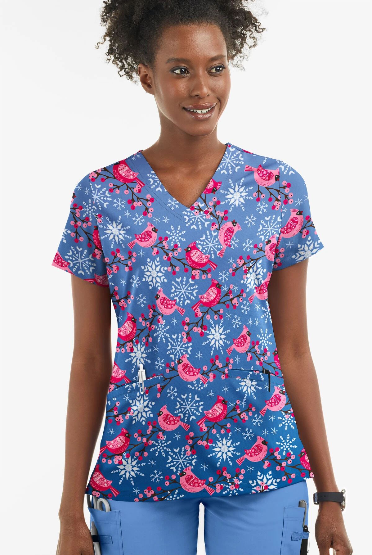 Sometimes itâs best to let the print do the talkingâwhich is why we kept the design of this top clean and simple. It has a classic V-neck and two discreet welt pockets (angled for flattery). This print is a sweet reminder that there’s no more hopeful sign than pretty little birds in winter.