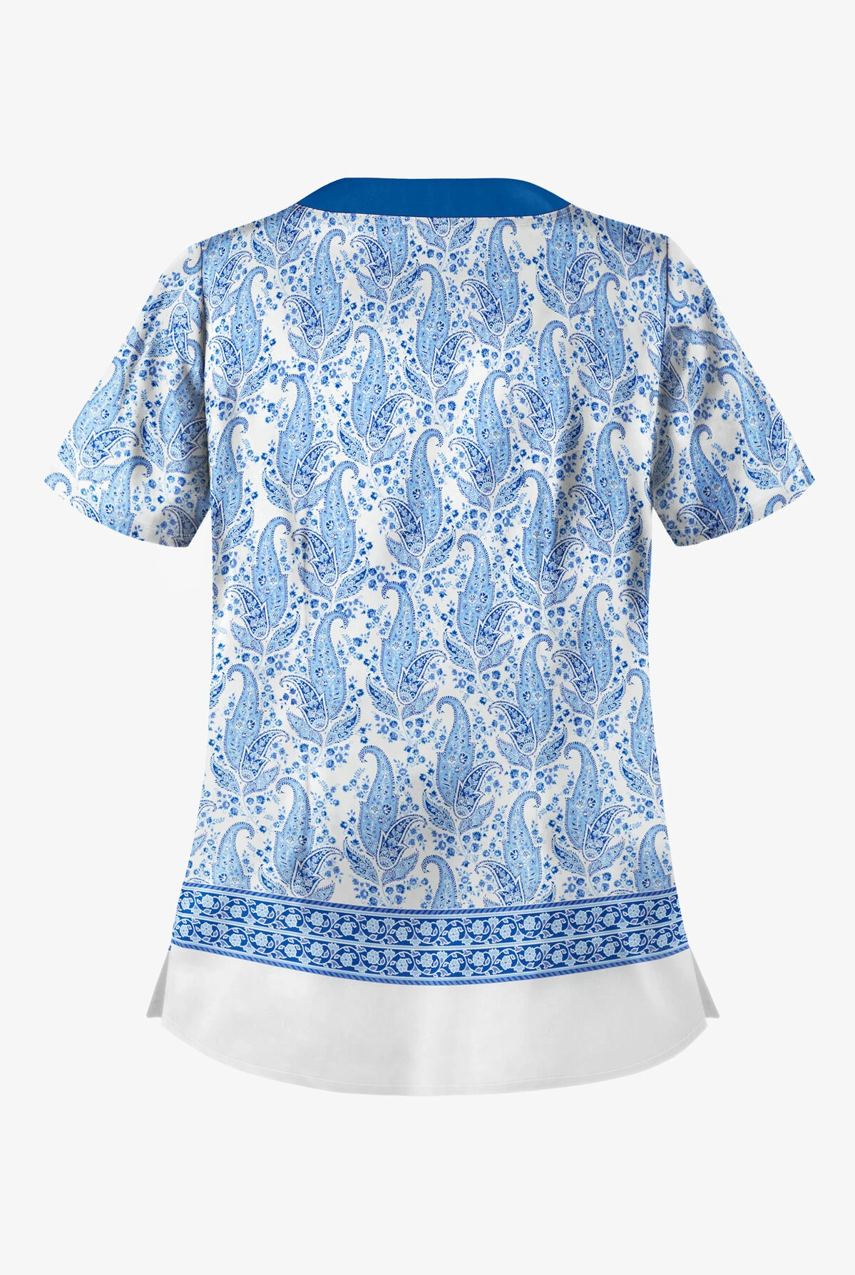 UA Best Buy Scrubs Floating Paisley White Print Women’s 2-Pocket Scallop Neck Scrub Top