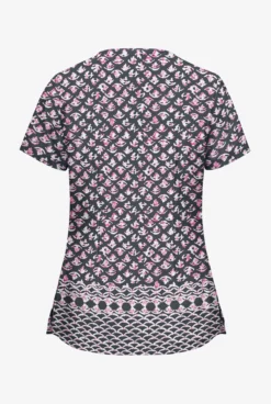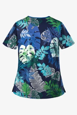 The UA Jungle Fronds Navy Princess Seam Print Scrub Top features a v-neckline and front yoke with Navy trim. Princess seams, back darts, and side slits create a flattering fit. This colorful scrub top has 2 double pockets to store all of your essentials. The fabric content is 55/45 cotton/poly.
