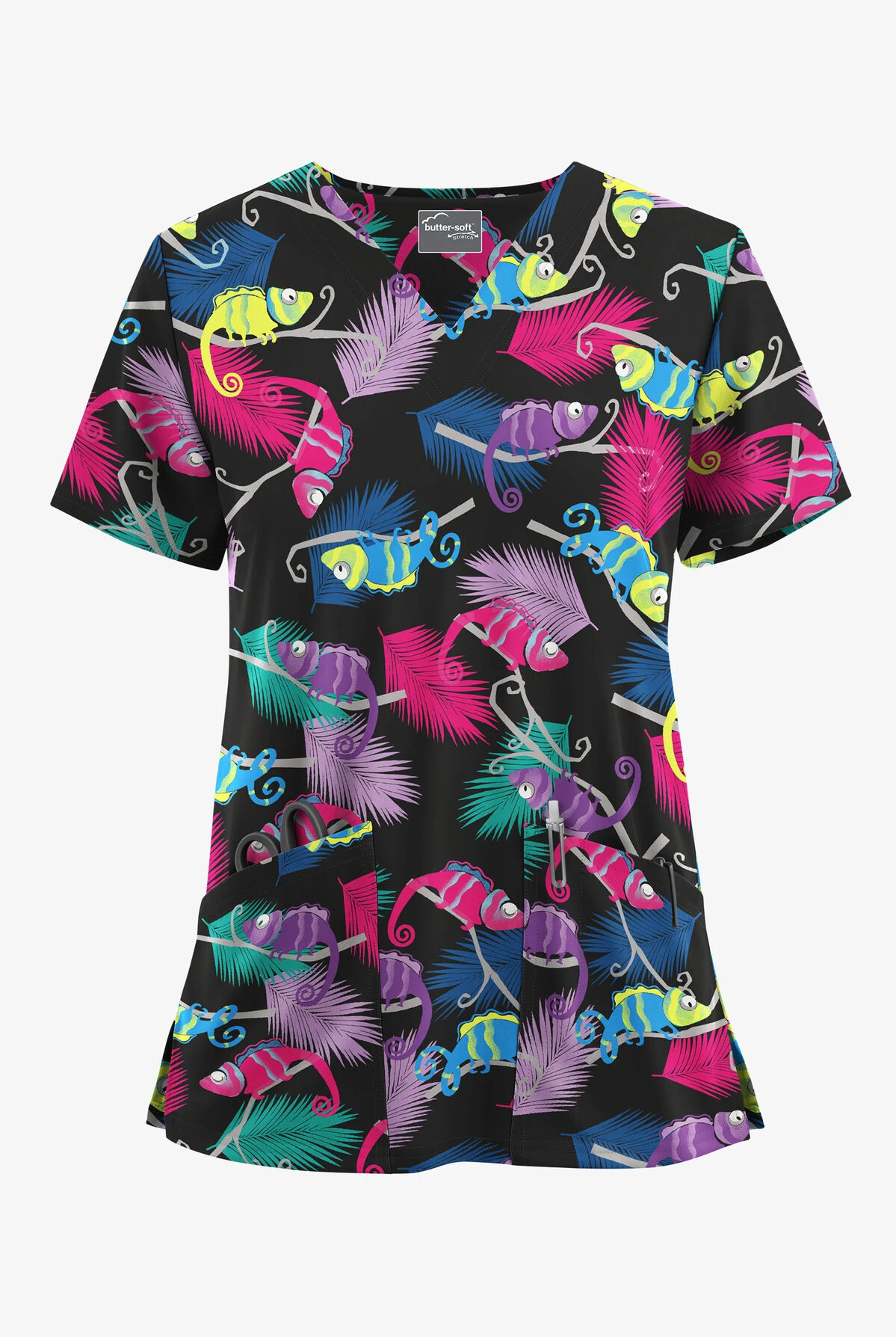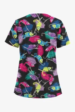 - Features bright and colorful chameleons on black
