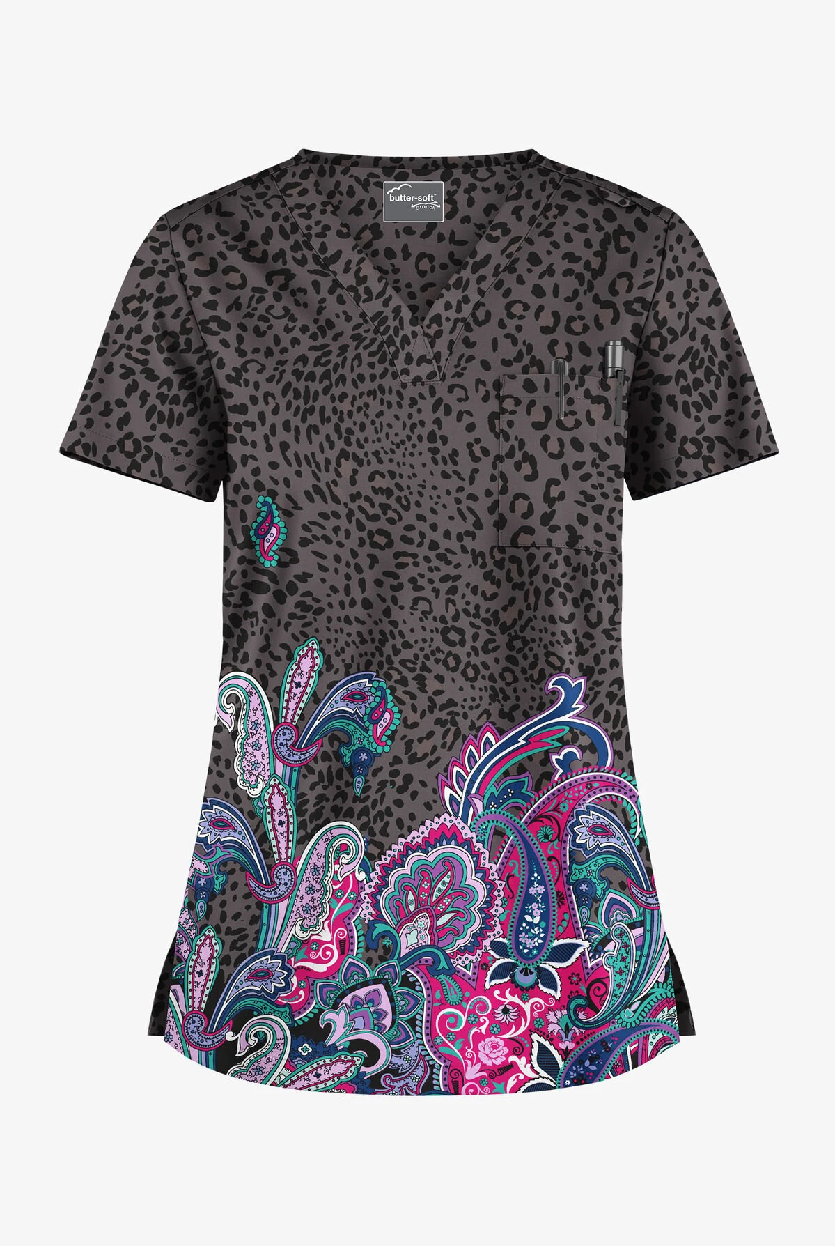 Our womenâs scrub top is a V-neck shape, with a twistâthe neckline has a slight curve and stitching that is both feminine and flattering. Simple, modern styling features a single front pocket. Each piece in our Butter-Soft STRETCH scrub collection was designed for 12+ hour shifts, and made from easy-care, 2-way stretch comfort fabric.