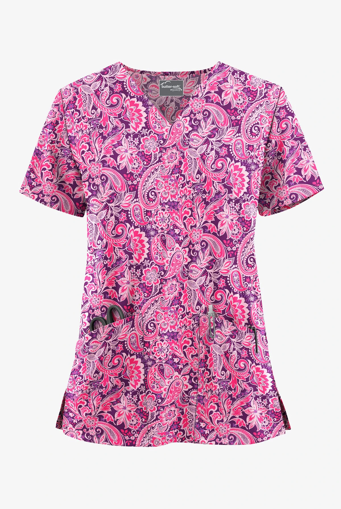 - Features a rich shades-of-pink paisley print on eggplant