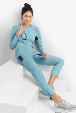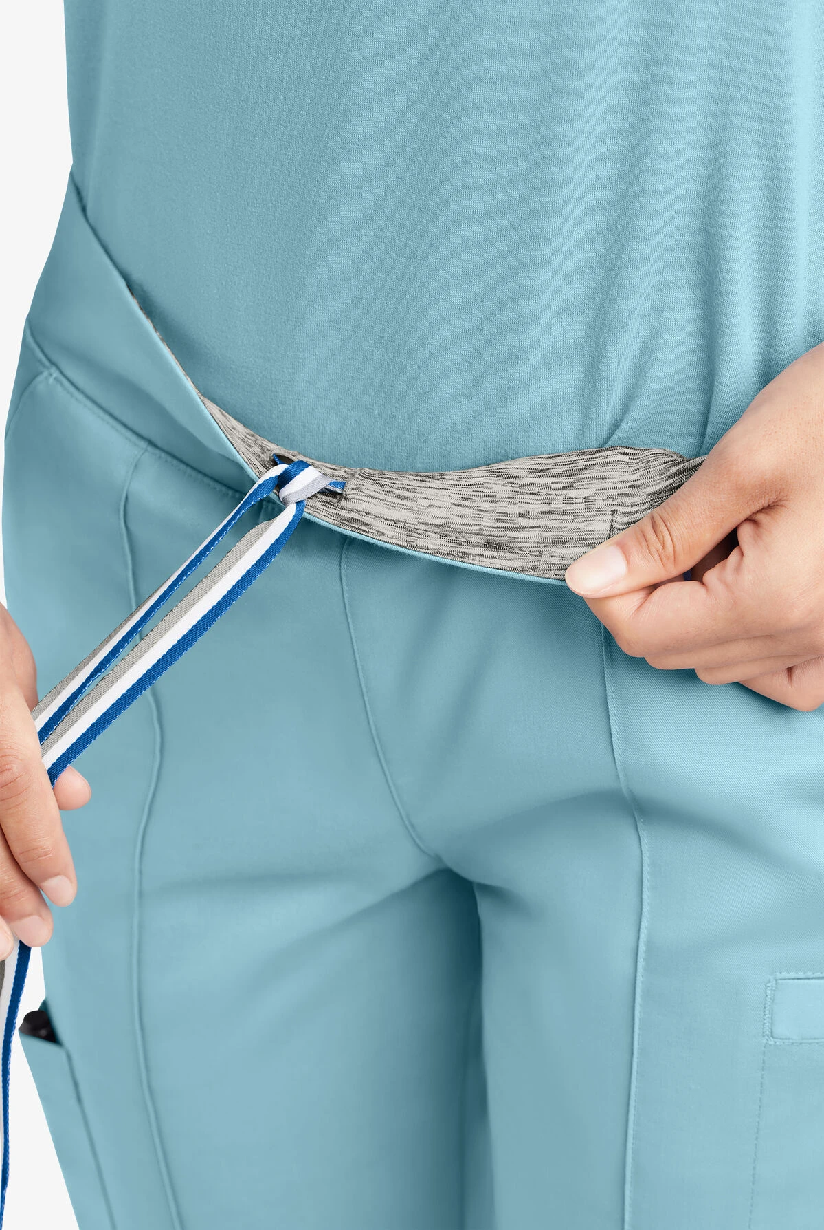These UA Butter-soft Stretch women’s 6 pockets pin-tuck crop slim with sport trim detail scrub pant feature a modern fit, mid rise with cropped slim leg. This pant has elasticated waist with inside contrast knit trim for comfort and adjustable sport striped drawcord for security. It has 6 pockets total; 2 angled front pockets, 1 small items zipper pocket, 2 welt pockets and 1 roomy cargo patch pocket. It also has side vents with contrast sport stripe trim and pin-tuck detail for a fashionable tailored look. Made of 55/42/3 cotton/poly/spandex.